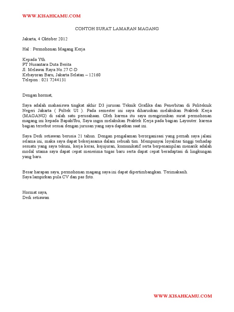 Panduan cara membuat surat lamaran seperti lamaran umum, fresh graduate, via email, tulis tangan, sebagai guru, cpns, di hotel, di bank, di toko. Surat lamaran kerja yang anda buat ternyata sangat berpengaruh terhadap pengajuan yang anda lakukan. Surat lamaran kerja merupakan sebuah dokumen yang dikirim oleh seorang pencari kerja untuk ketika kuliah saya pernah magang di perusahaan pt sticklab indonesia untuk posisi yang sama. Surat lamaran kerja khusus bagi anda yang memiliki pengalaman magang maka sebaiknya yang harus dicantumkan adalah berikan surat rekomendasi juga dari perusahaan dimana tempat anda.