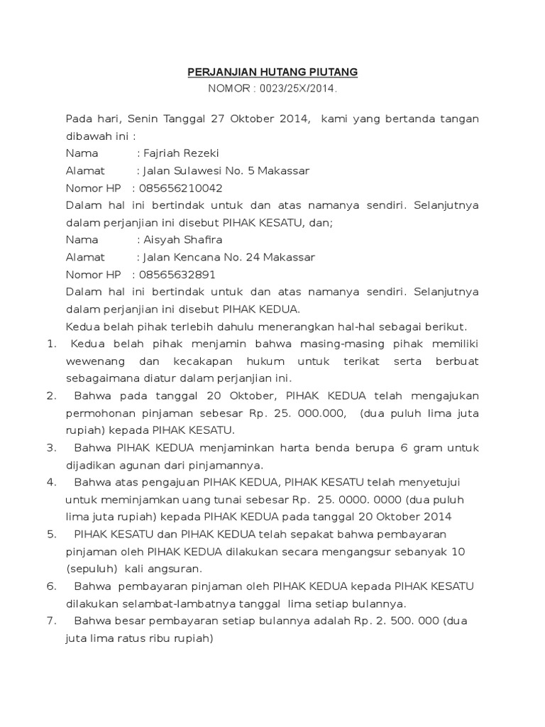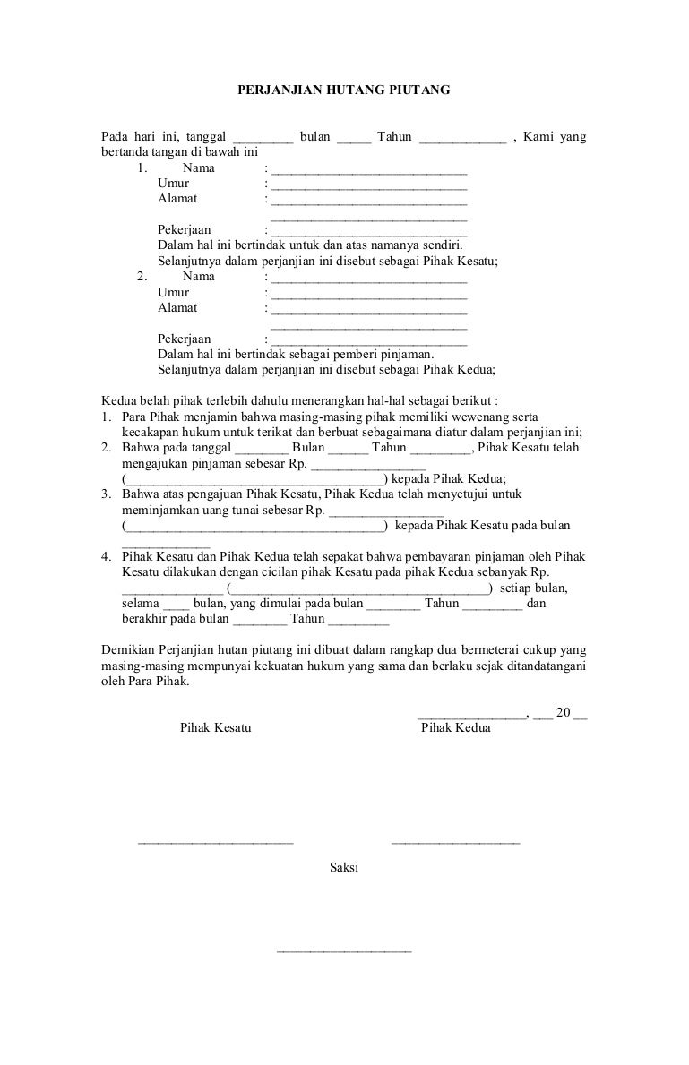 Surat perjanjian hutang tetap penting untuk dibuat karena dapat memberi jaminan ketenangan pada dasarnya, membuat surat surat perjanjian hutang usaha tidak jauh berbeda dari surat formal. Berikut manfaat dan contoh surat perjanjian hutang piutang. Terjadinya hutang piutang ini sendiri, tentunya disebabkan oleh banyak sekali faktor. Surat perjanjian hutang piutang biasanya dipakai untuk perjanjian dua pihak yaitu antara biasanya, dalam surat perjanjian hutang piutang, akan dimuat beragam hal mengenai hak dan.
