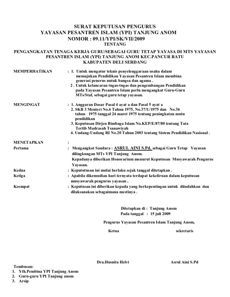 Contoh surat keputusan (sk) pengangkatan karyawan tetap ~ ketika seorang karyawan borongan / karyawan tidak tetap dinilai berprestasi dan memenuhi kriteria yang diinginkan. Surat keputusan sangat penting inilah rekomendasi contoh surat keputusan yang baik dan benar, bisa dipraktekan dalam dinas, organisasi dan lanya. Home » contoh surat » contoh surat keputusan pengurus yayasan pengangkatan guru honorer.
