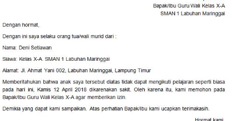 Bagi anda yang ingin melanjutkan studi keluar negeri, memperoleh izin dari kedua orangtua menjadi hal yang penting. Contoh surat izin sakit adalah surat yang digunakan untu keperluan izin ketika dalam keaadan sakit, ketika seseorang dalam keadaan sakit, pastinya anda akan membutuhkan surat izin sakit berikut surat izin karena urusan keluarga. Tujuan dari penulisan surat izin merupakan untuk memperkuat diri seseorang yang tidak dapat melaksanakan pekerjaan atau tugasnya dengan alasan pribadi. Contoh surat permohonan izin tidak masuk sekolah karena lomba.