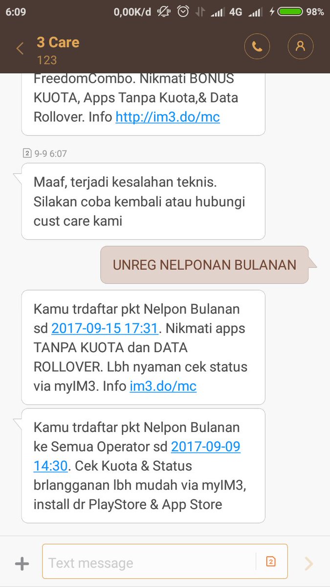 Get Berhenti Paket Nelpon Mingguan Ke Semua Operator M3 PNG. Berlangganan paket nelpon atau sms mungkin bisa lebih menghemat biaya, namun jika dirasa sudah tidak lagi seberapa membutuhkan, ada baiknya kita unreg status langganan tersebut sehingga pulsa kita tidak akan terpotong terus. Saya pake m3 pulsa kesedot terus padahal tdk dipake selama 1hari.