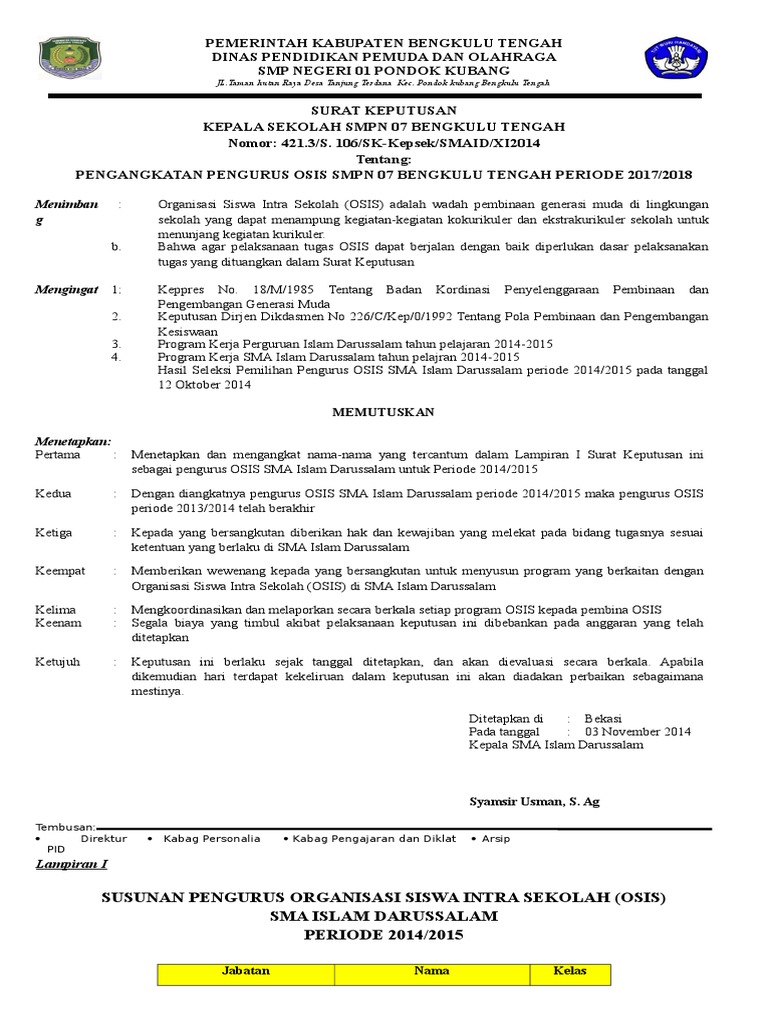 Contoh sk pelantikan pengurus mpk dan osisdeskripsi lengkap. Salam sejahtera, berdasarkan agenda kegiatan kepengurusan osis tahun 2016 dan telah berakhirnya masa 3 bulan pertama kepengurusan osis. Masa bhakti tahun 2018/2019 #suratkeputusan #pengurusosis #smpn1wonogiri. 4235 2010 tentang pengurus osis perwakilan kelas dan pembina osis tahun pelajaran 2010 2011 menimbang.